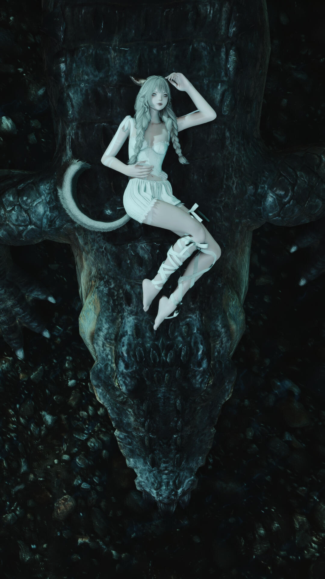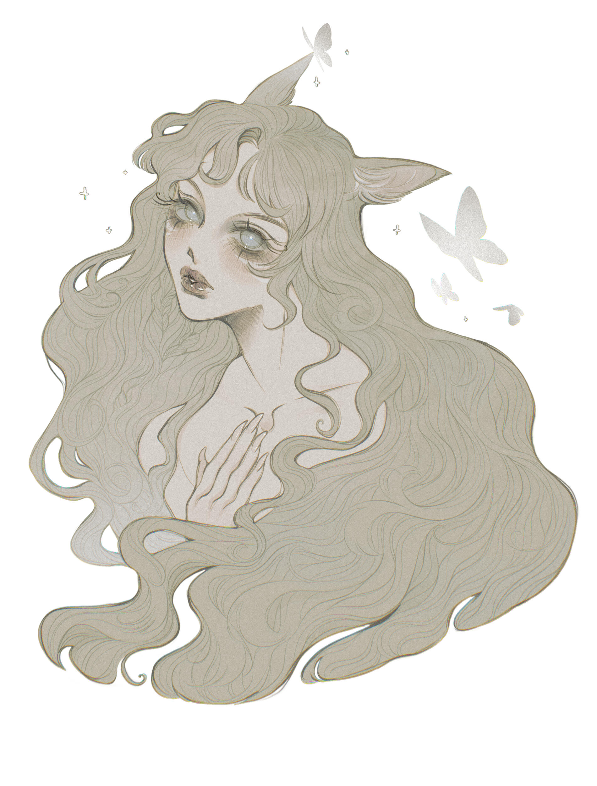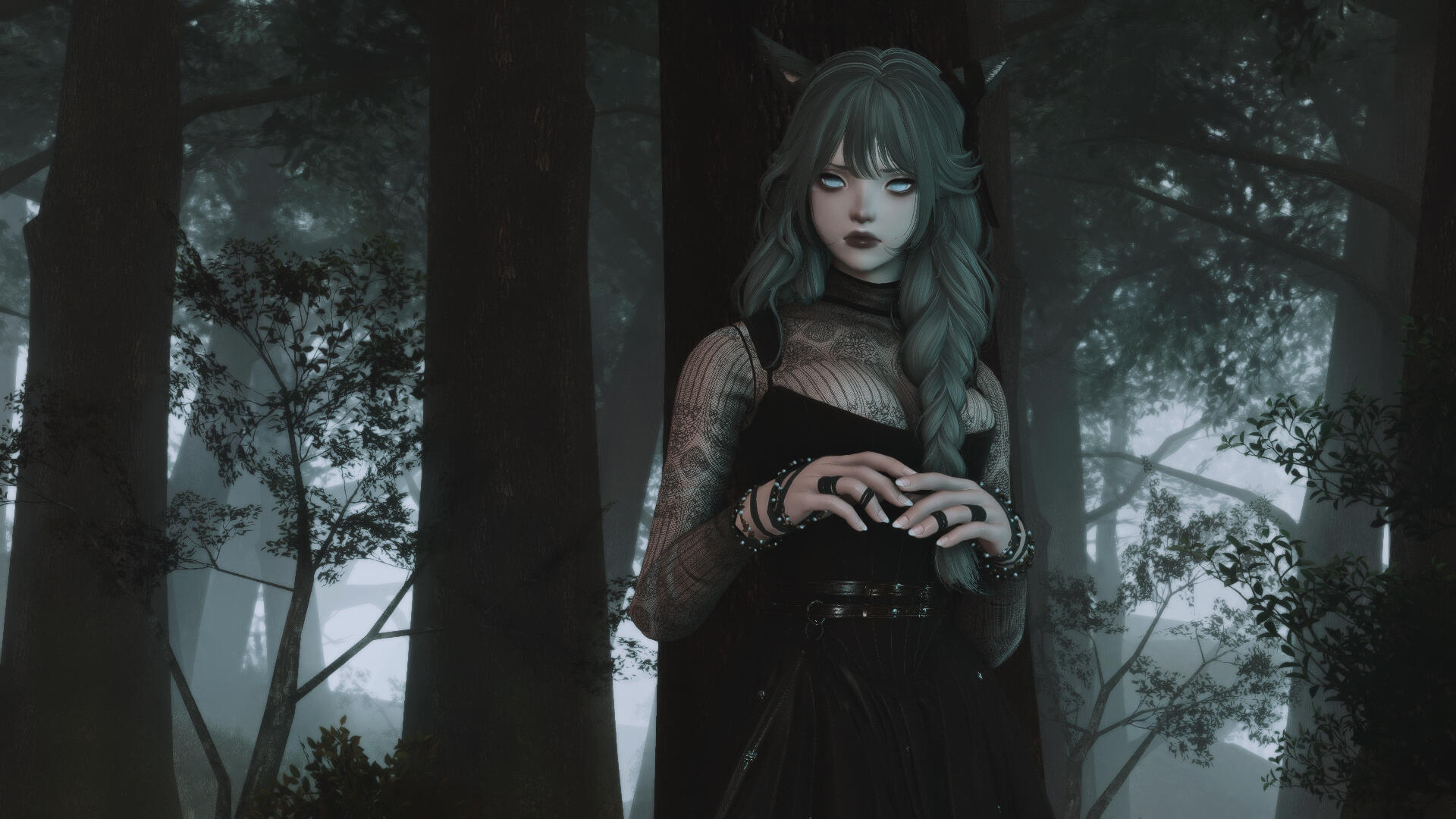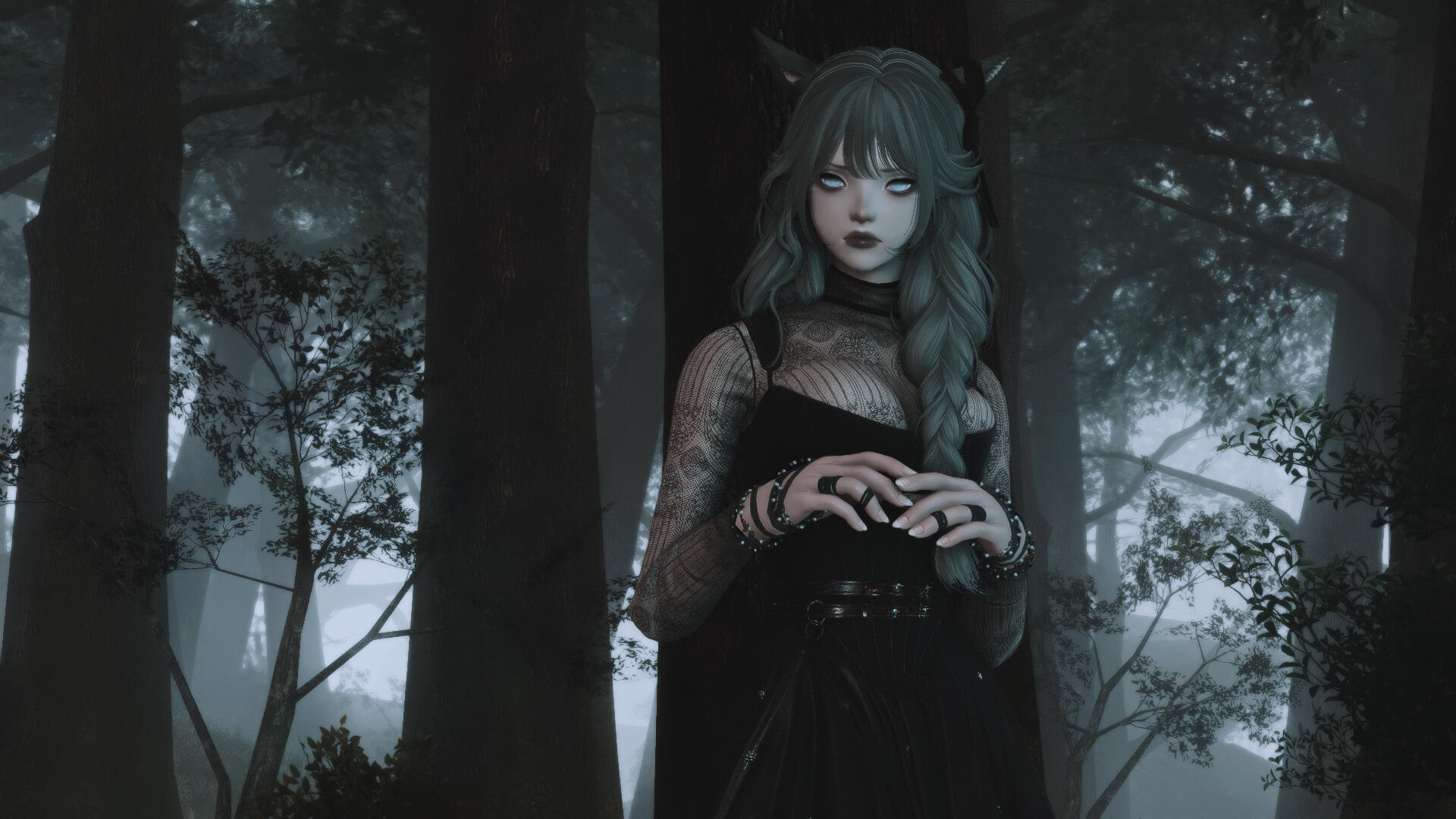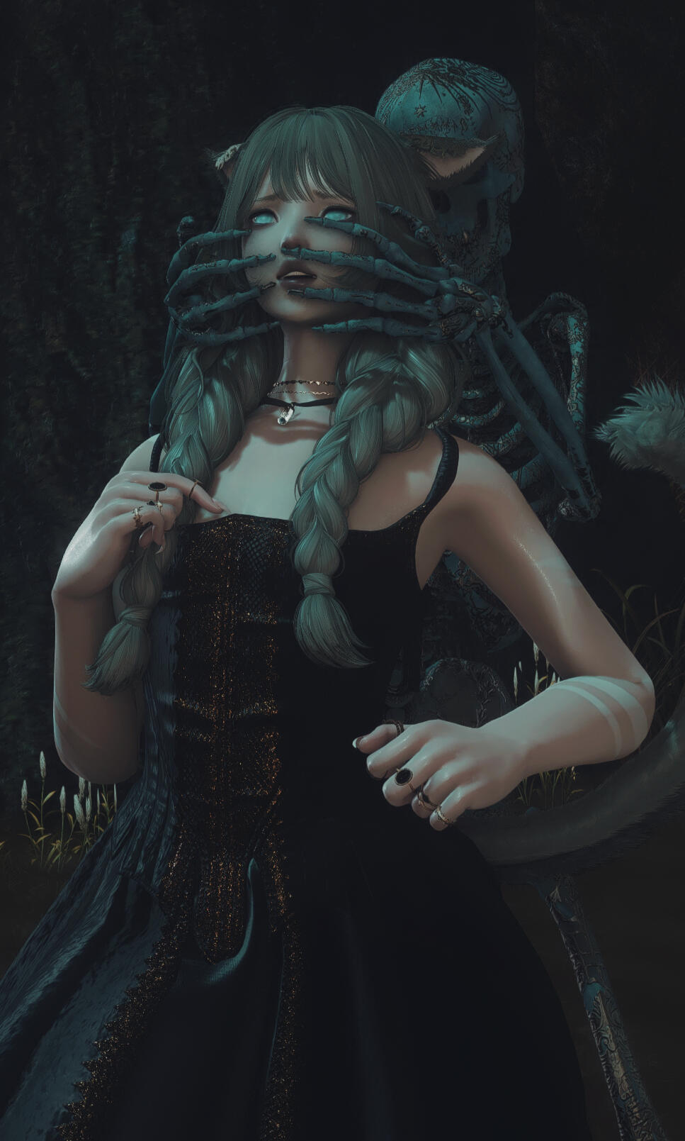 | hair. near-engulfing waves of waist-length ash, often scattered with small braids. |