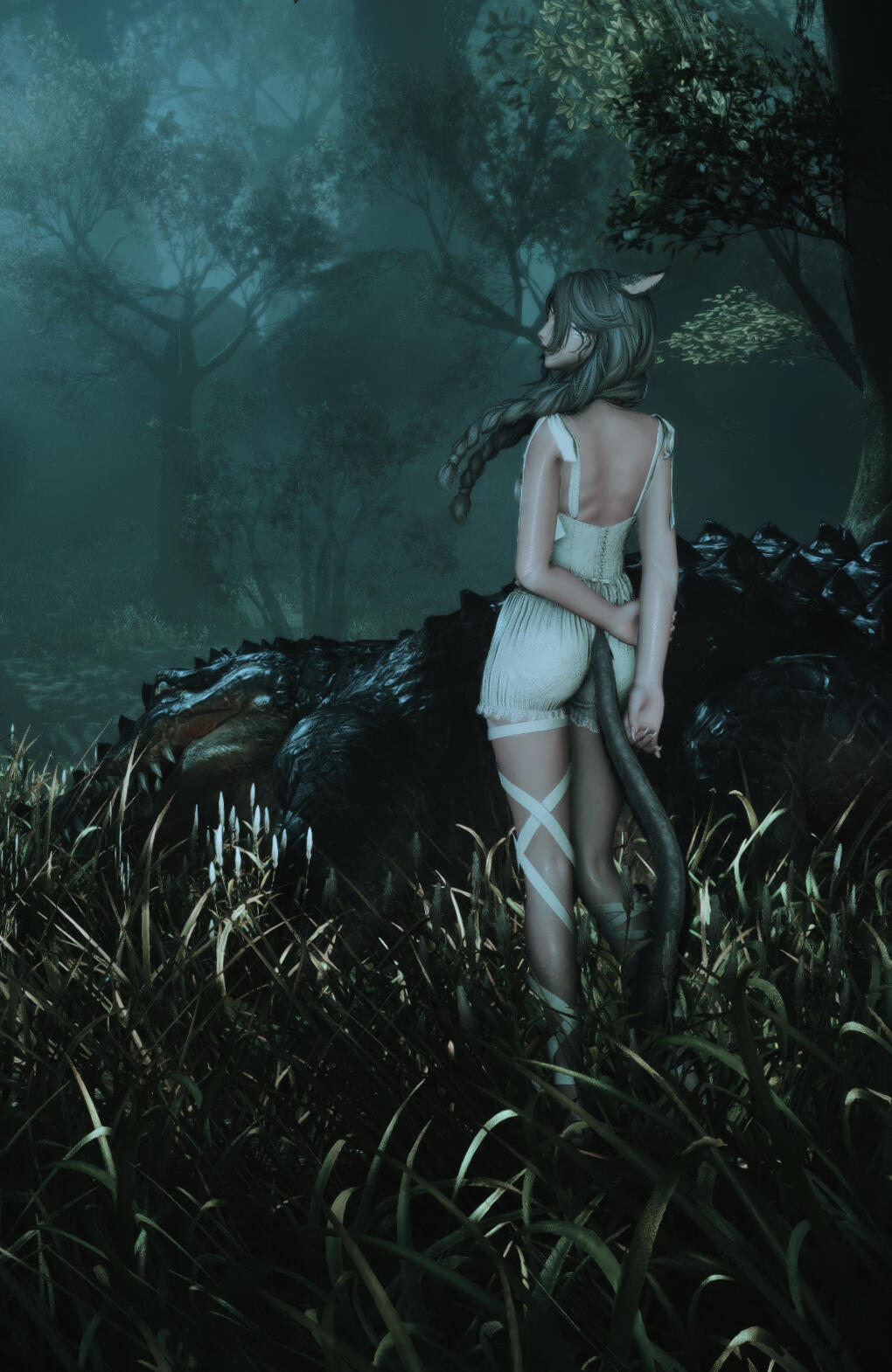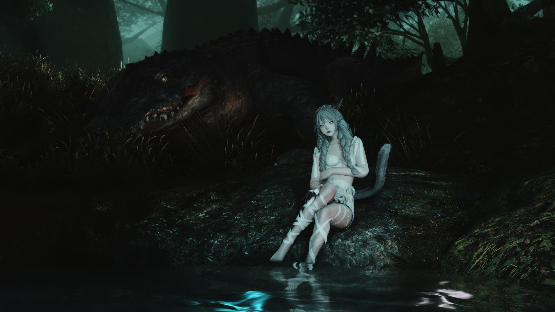 O The girl is known to travel atop the back of a great dark-scaled beast, cooing and whispering towards its gaping maw. While she roams throughout the boglands, the creature is certainly never far from the tender call of its matron.O She tends to recognize and remember others by their voices or, once witnessed, their small quirks. Otherwise she's quite a forgetful thing, and rather faceblind.