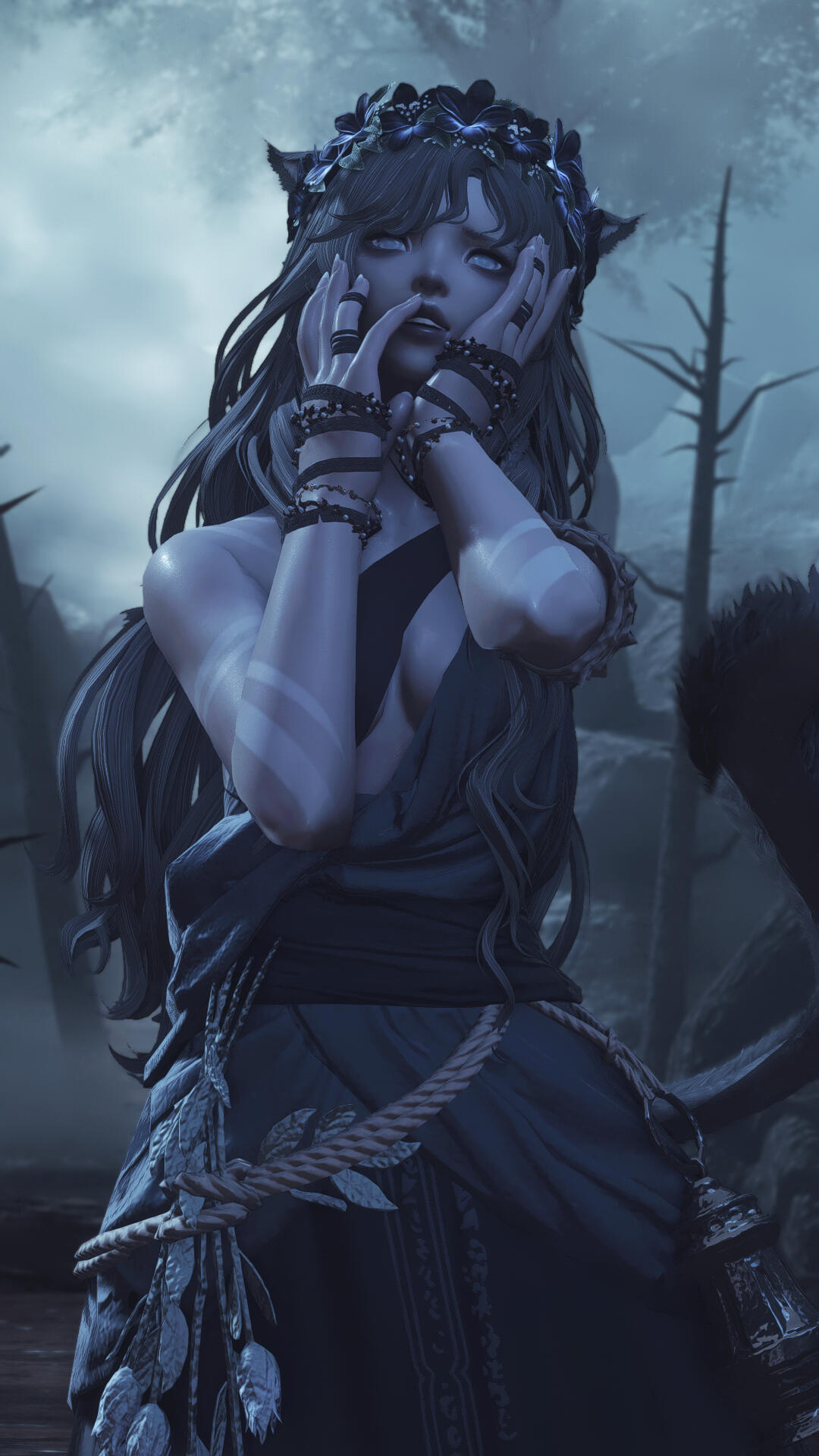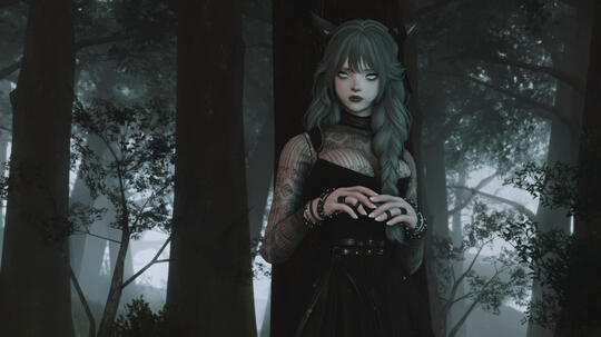 Arcane circles drift with whispers of a creature roaming the Shroud marshland during its most unholy hours — how it crawls along its banks, more wraith than woman. Though they warn of her gaze, the curious and desperate alike yet seek her out, enticed by her rumored talents in spellcraft and the prophetic arts.It is said she severs minds to stitch them anew, that she pulls visons of the future from the river's currents, that her song can stir the dead. Be prepared to give, in kind.